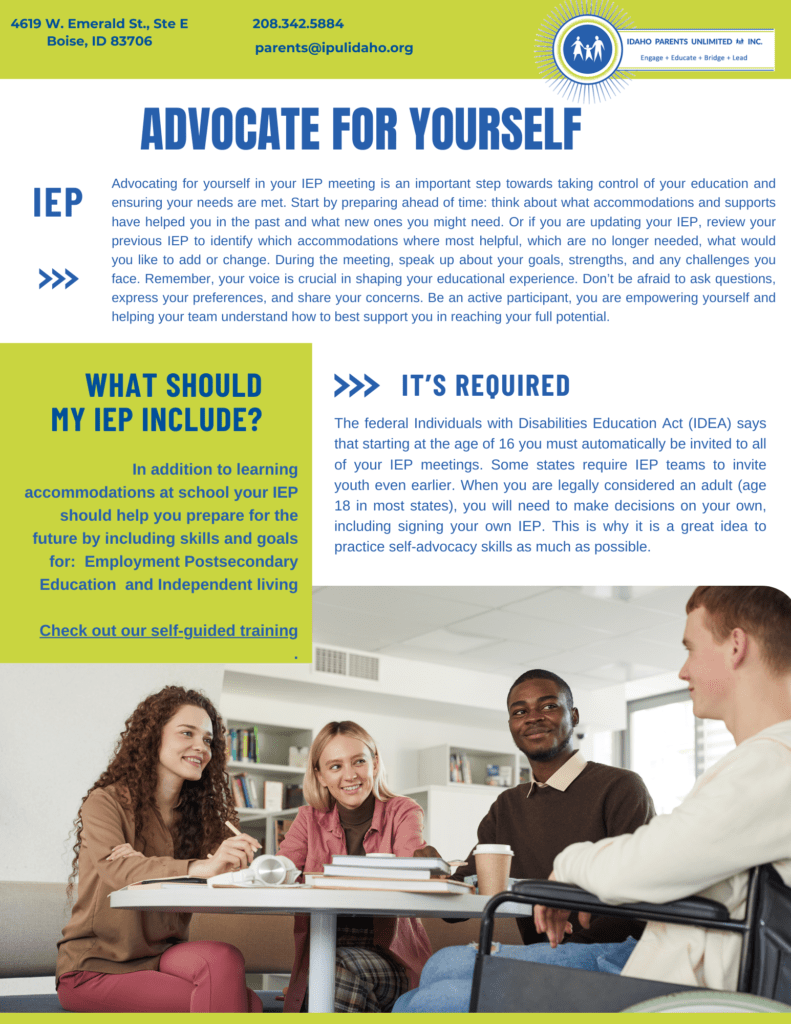 In addition to learning accommodations at school your IEP should help you prepare for the future by including skills and goals for: Employment Postsecondary Education and Independent living Check out our self-guided training.