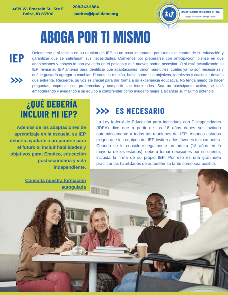 Además de las adaptaciones de aprendizaje en la escuela, tu IEP debe ayudarte a prepararte para el futuro incluyendo habilidades y metas para empleo, educación postsecundaria y vida independiente. Consulta nuestro entrenamiento autodirigido.