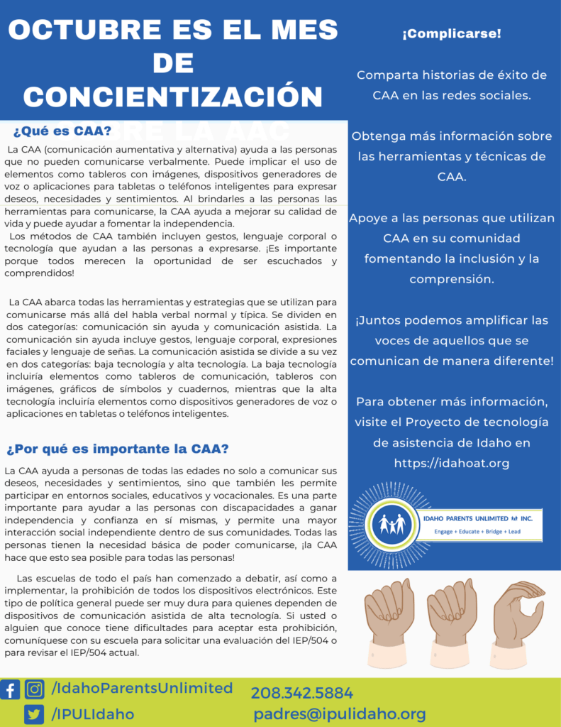 Para obtener más información, visite el Proyecto de tecnología de asistencia de Idaho en https://idahoat.org